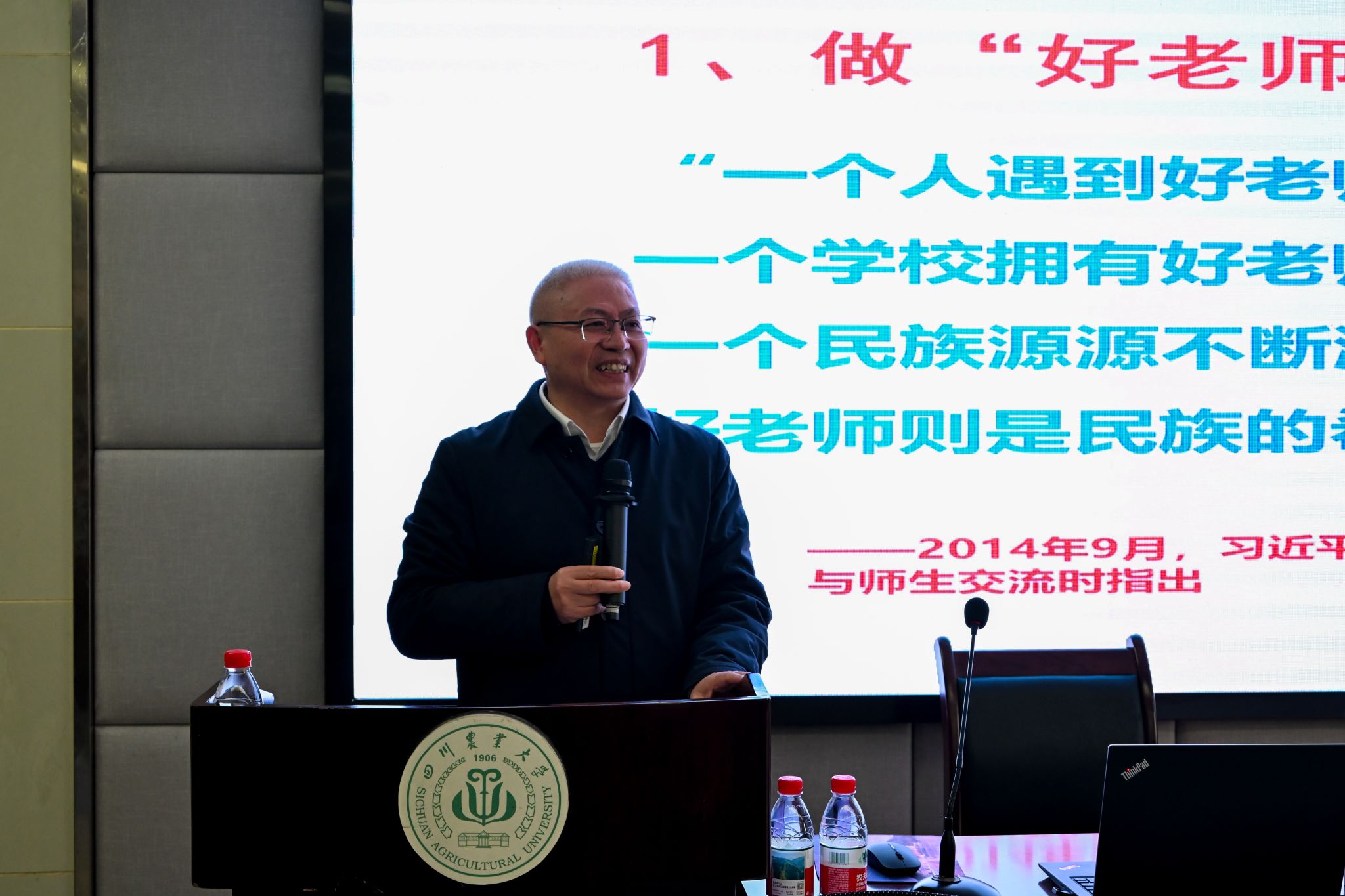 校长吴德教授以《做川农大高质量发展的担当者》为题作专题报告。他强调,新教师要大力弘扬“川农大精神”,秉承“追求真理、造福社会、自强不息”的校训,成为学校发展的中坚力量。既要潜心教书育人,用心备好每一堂课,关爱学生成长;又要扎根学术研究,沉心静气追求真学问,力争产出创新成果。他希望全体新教师尽快融入学校发展,共同担当起个人成长与学校事业的双重责任,以实干实绩助推学校“双一流”建设,真正成为有理想信念、有道德情操、有扎实学识、有仁爱之心的“四有”好老师。