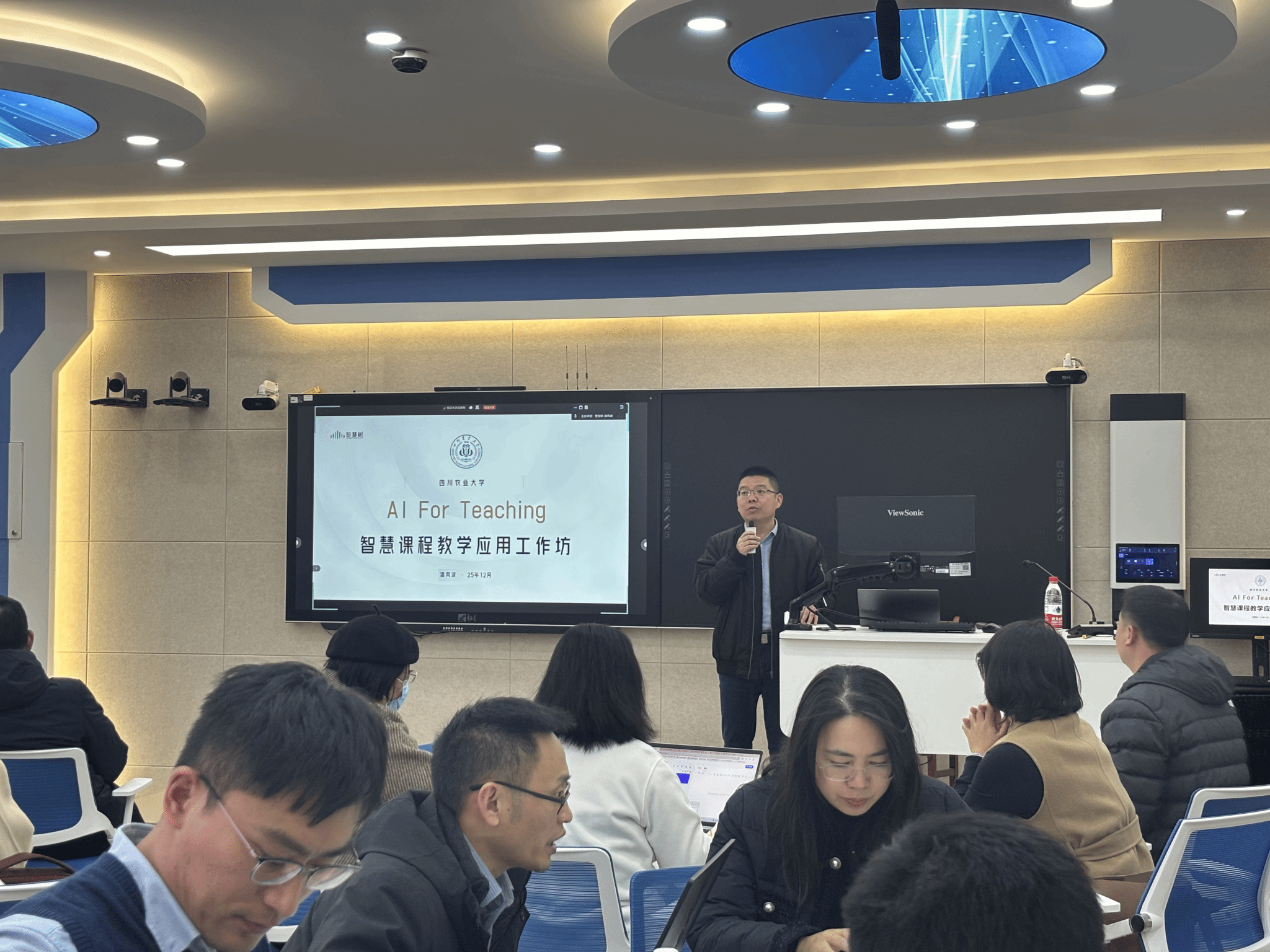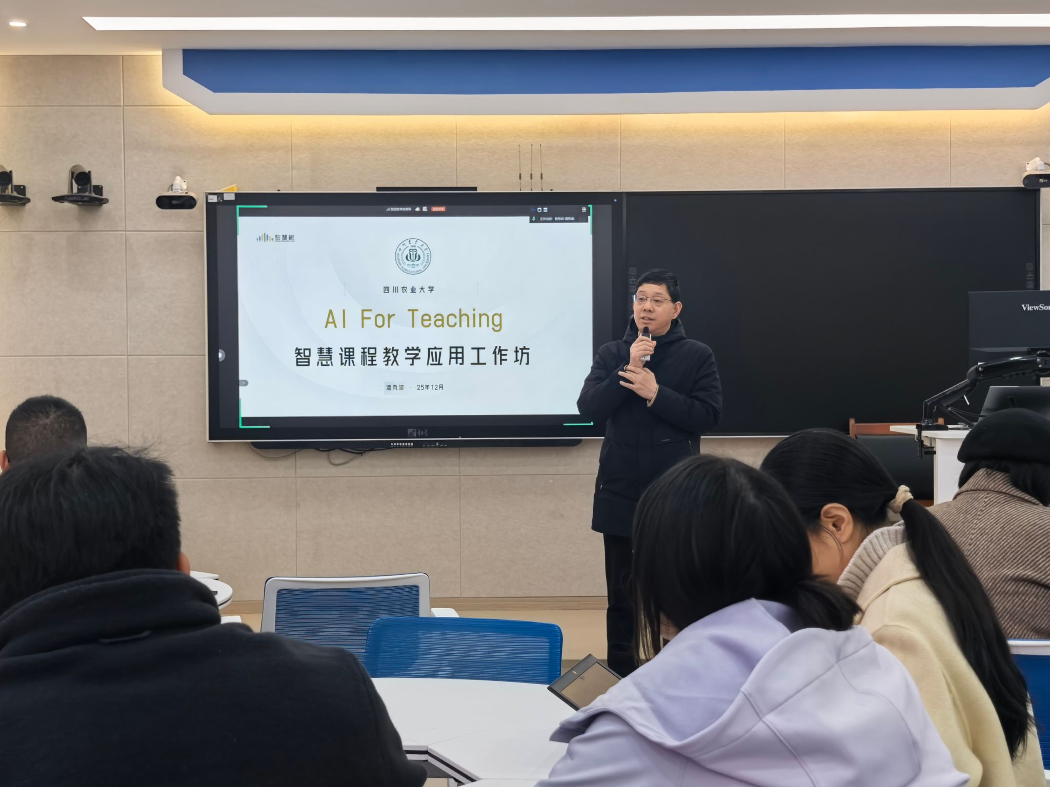 为深入推动教育教学数字化转型,以技术创新赋能课程建设与教学模式革新,提升教师数字素养与教学创新能力,12月2日下午,教务处与教师发展中心联合智慧树网,成功举办了“AI For Teaching——智慧课程教学应用工作坊”。本次活动采用线上线下结合方式,吸引了100余名教师参与。工作坊由教务处副处长刘国军主持。